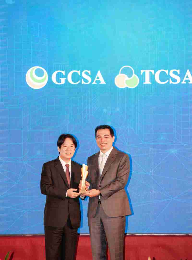 达全方位永续表现获全球永续奖及台湾永续奖肯定,,由副总统赖清德颁奖 (左),,,开云电子总经理柯富仁 (右) 代表领奖
