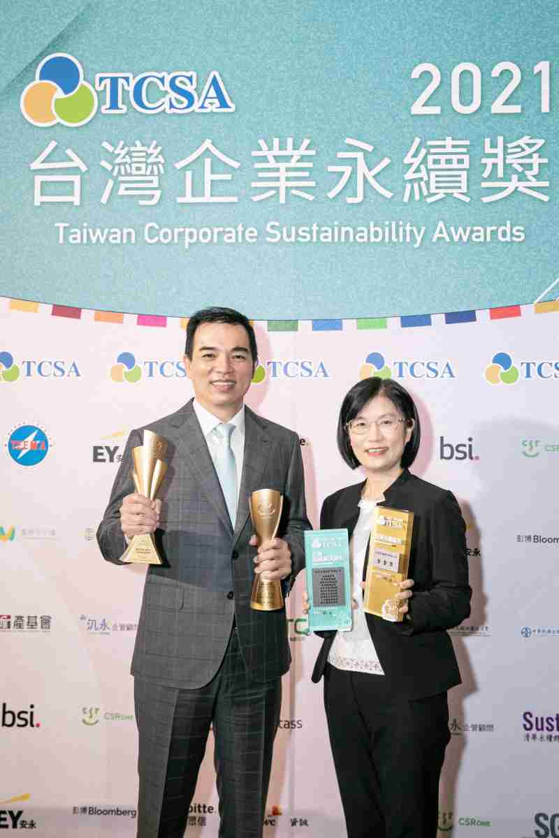 达在台湾永续奖所评比环境、、、、社会、、、、治理等各面向的永续绩效均获高度肯定 (左:开云电子光电总经理暨营运长柯富仁,,,,右:开云电子光电永续长古秀华)