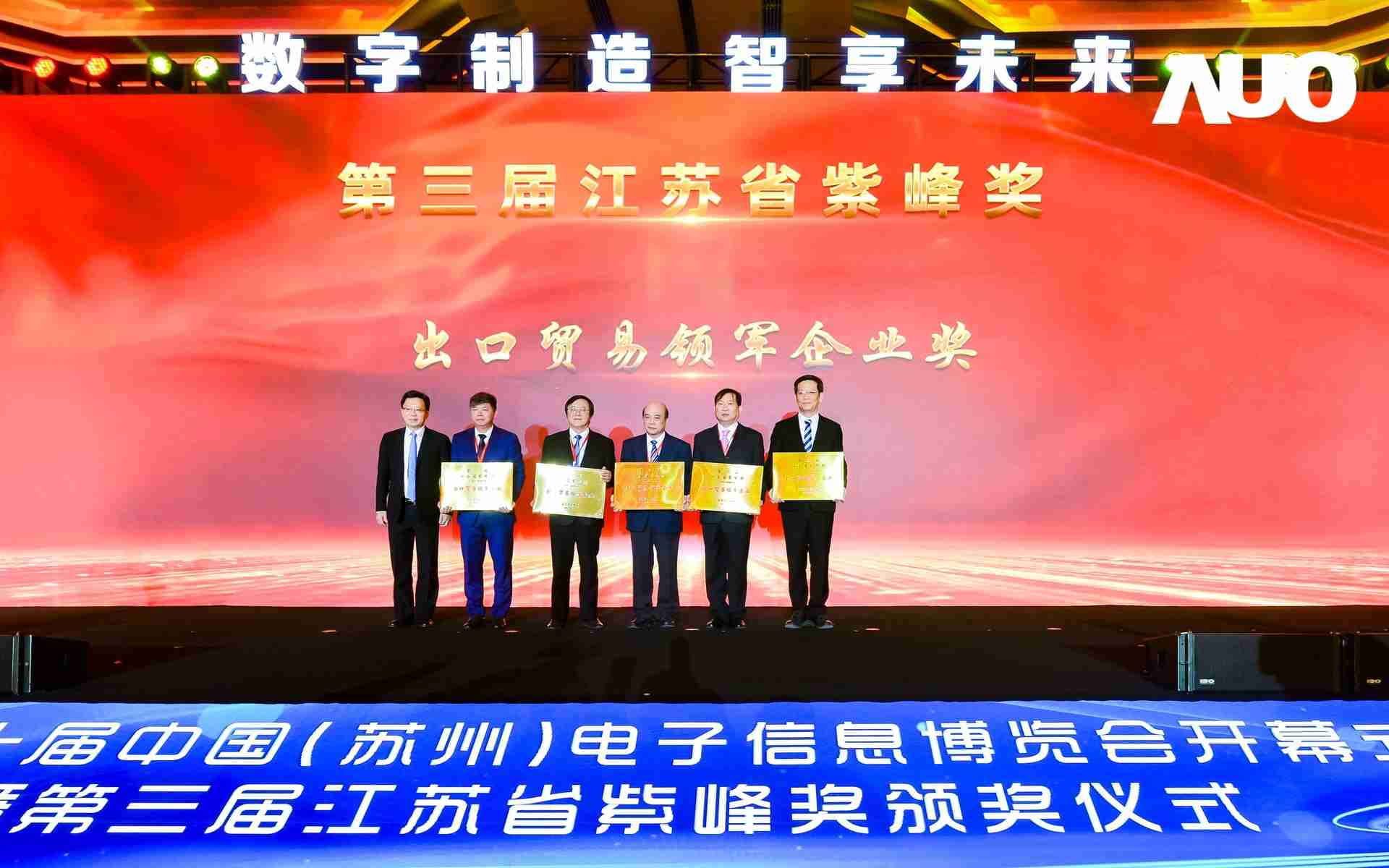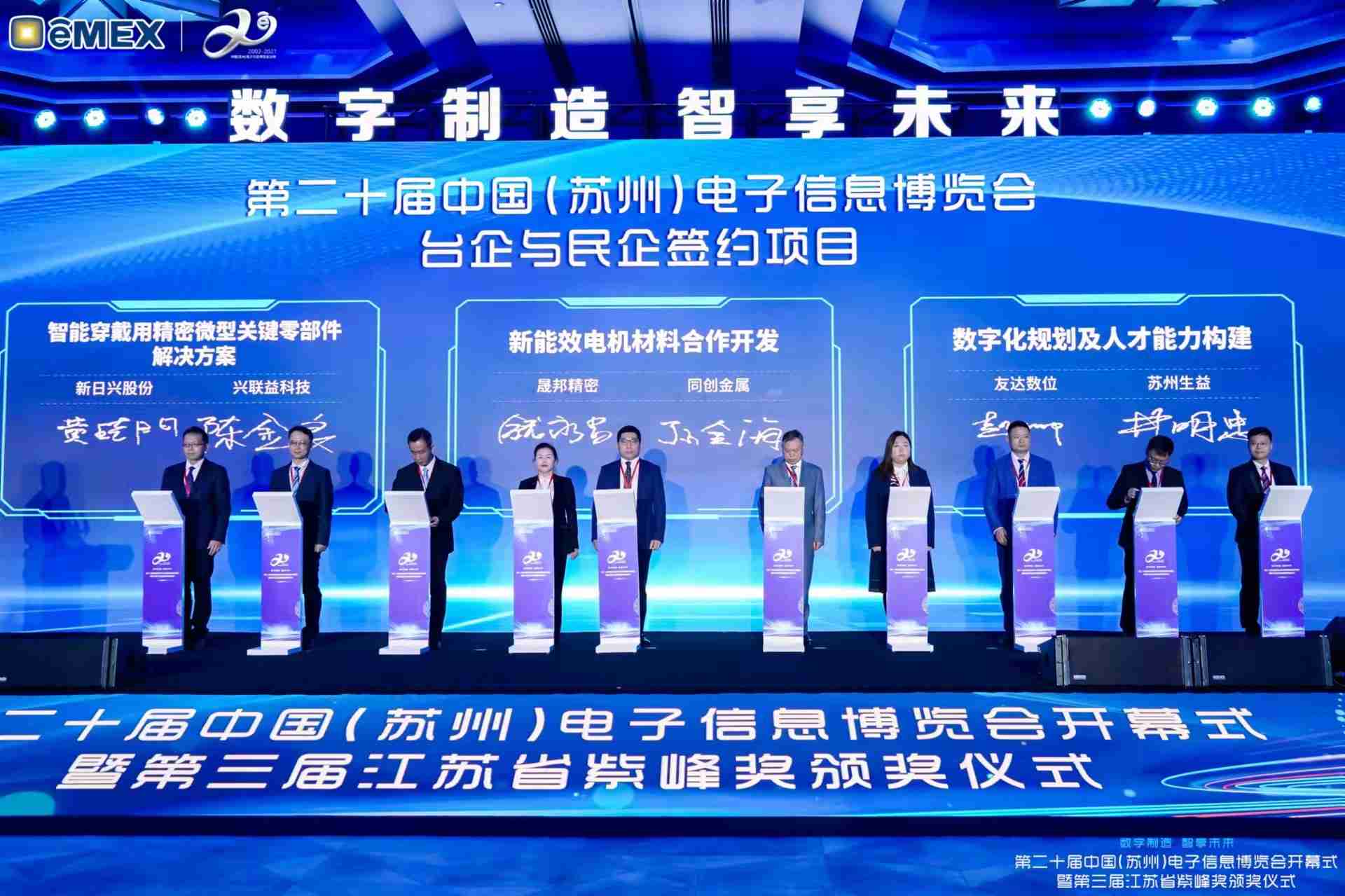 电博会开幕式当天也是第三届江苏省紫峰奖颁奖仪式,,,省台办、、、、工信厅、、、商务厅、、、苏州市相关领导均出席并颁奖。。该奖项为表彰对江苏高质量发展做出积极贡献的在苏企业,,,,由江苏省政府专门设立。。。。开云电子光电 (苏州) 总经理郭振明代表上台领奖,,这也是开云电子苏州连续三次蝉联紫峰奖 出口贸易领军企业奖。。开云电子数位总经理赵丽娜女士,,,,也参与本次开幕式,,上台为本地化赋能签署战略合作协议,,将优质服务资源集合、、、下沉到更多细分行业,,,为更多地区的制造企业提供数字化转型服务。。。